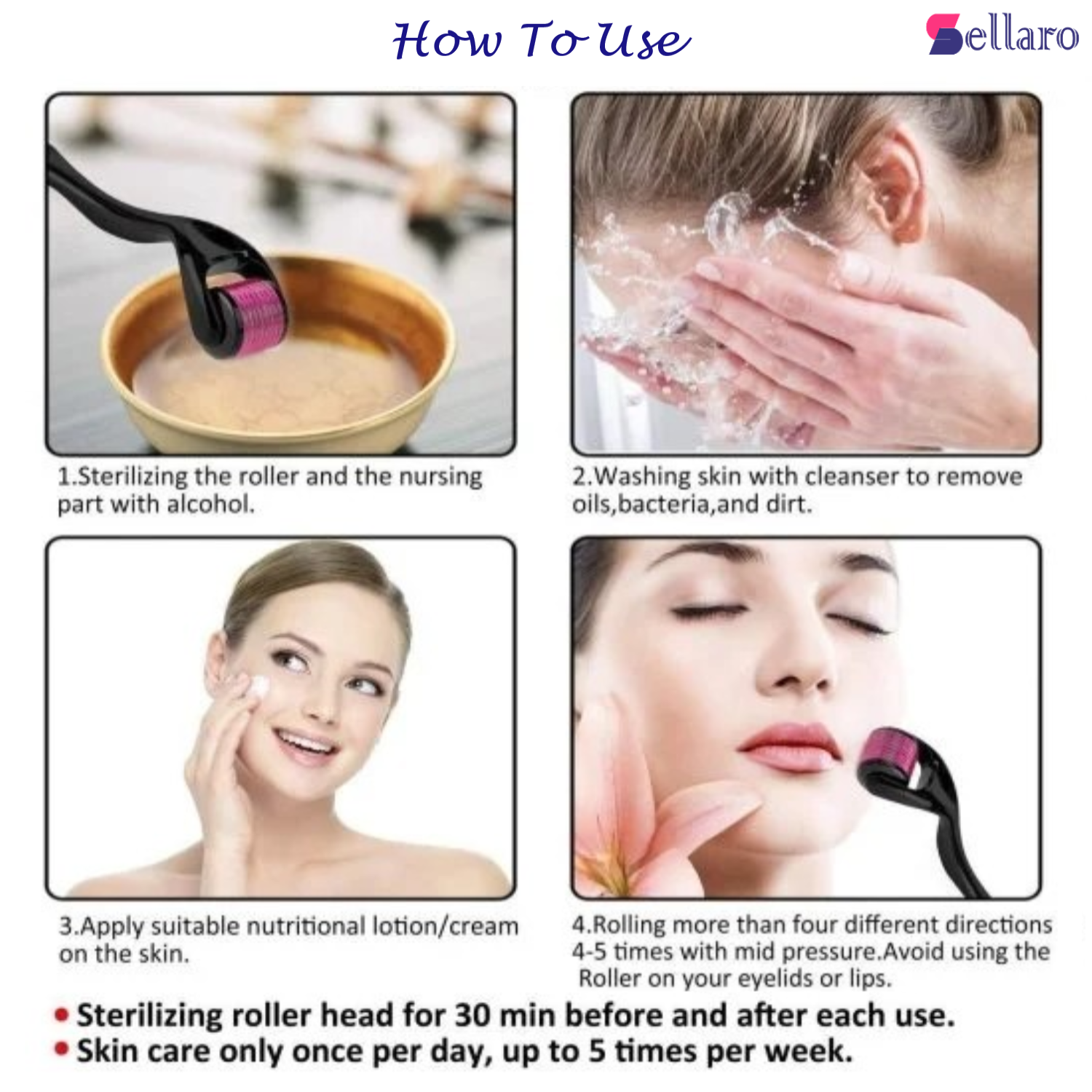 - To obtain best result, cleanse your face or any area that needs treatment with warm water and use the derma roller 2 times per week/10-15 minutes.